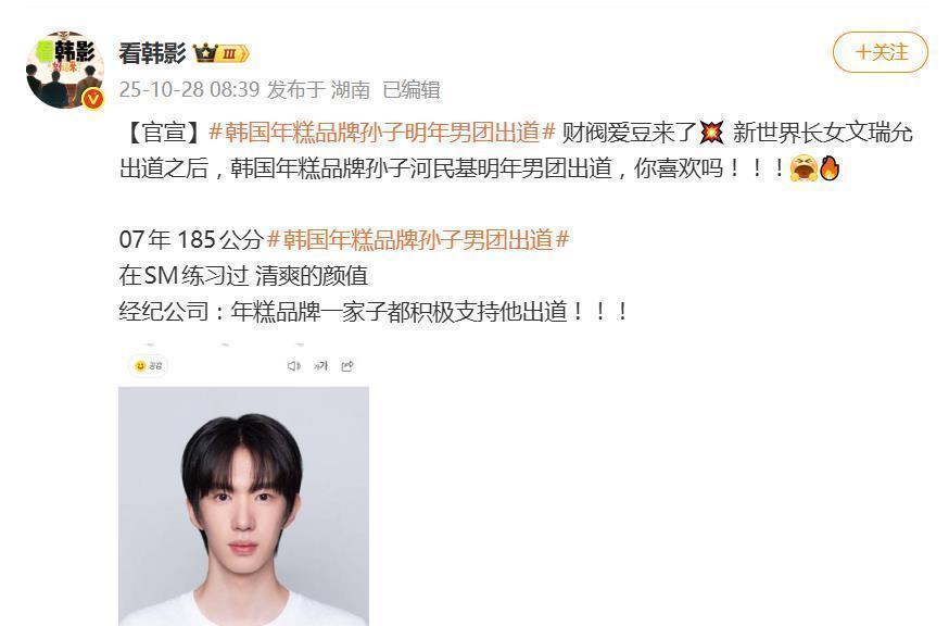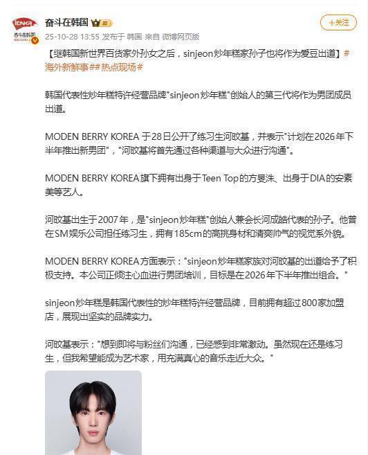 韩国偶像圈又迎来一位“含金量”十足的练习生——2007年出生、身高185cm的河民基,近日官宣将于2026年下半年以男团成员身份出道。不过,比起他的清爽颜值和SM娱乐练习经历,更引人注目的是他的另一个身份:韩国最大连锁炒年糕品牌“神殿炒年糕”创始人河成浩的亲孙子。